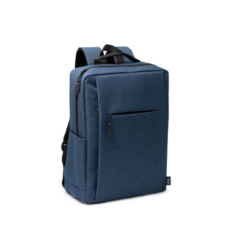 Realizzato in RPET 600D da bottiglie riciclate con elegante finitura screziata, questo zaino unisce stile urbano, resistenza e sostenibilità. Lo scomparto principale imbottito protegge laptop fino a 15”, la tasca frontale organizza accessori e la tasca laterale ospita borracce o ombrelli. Spallacci e manici imbottiti assicurano comfort, mentre la cinghia per trolley semplifica i viaggi.