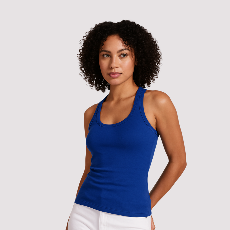 Canotta aderente essenziale, in 100% cotone (grigio vigoré: 85% cotone, 15% viscosa). Il taglio slim valorizza la silhouette, mentre le spalline a vogatore liberano le spalle e garantiscono libertà di movimento. Dettagli curati come cuciture e orli resistenti uniscono comfort e durata. Perfetta da sola in estate, in palestra o come base sotto altri capi.